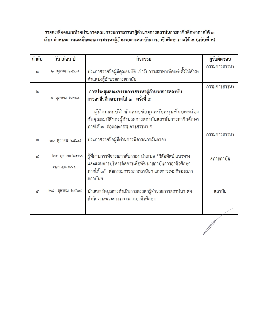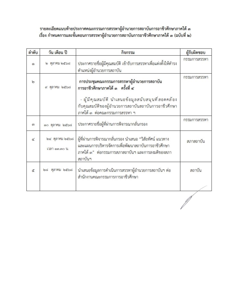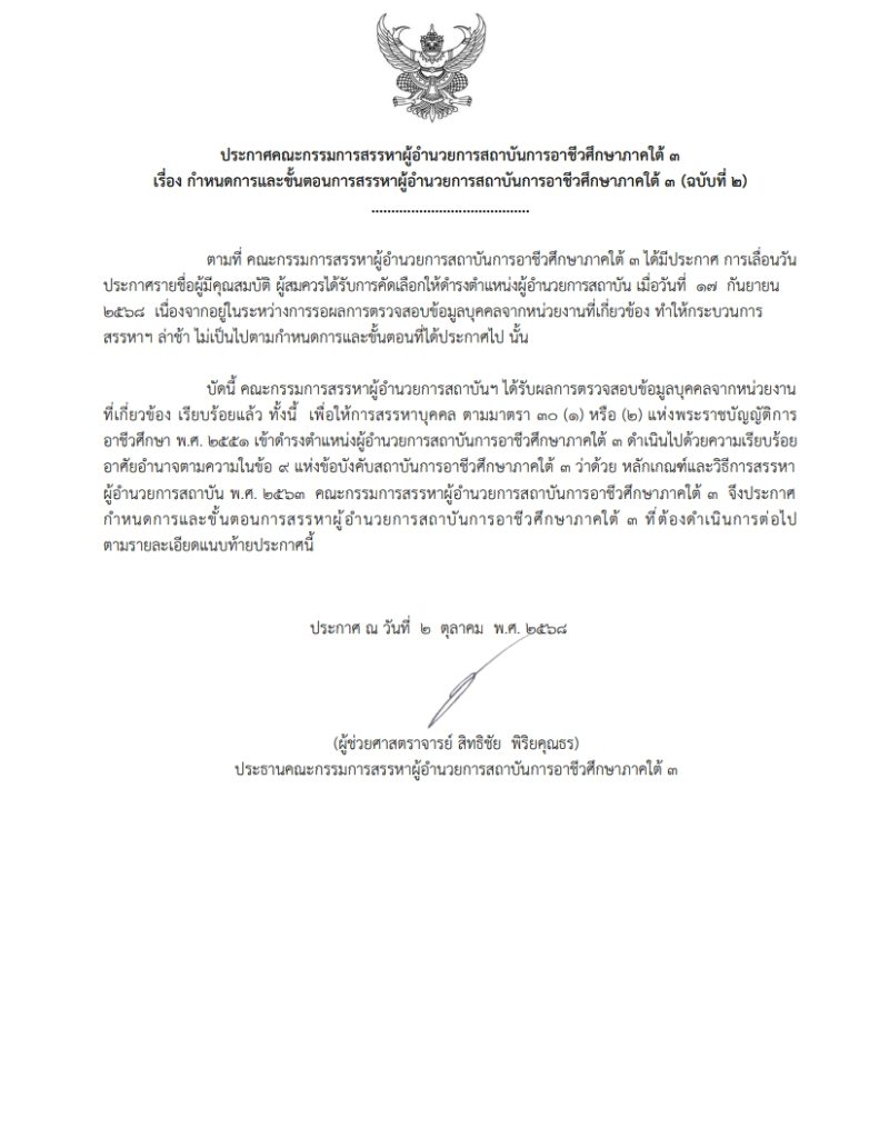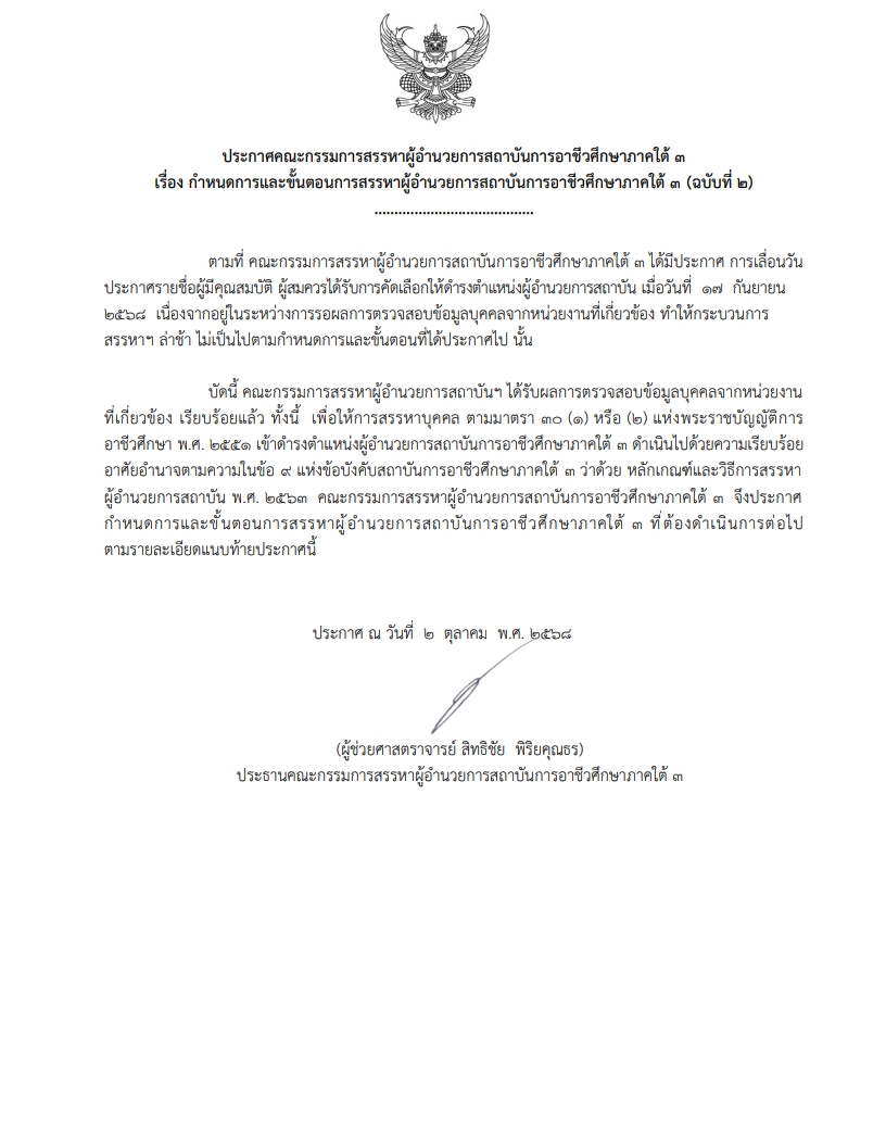 เรื่อง กำหนดการและขั้นตอนการสรรหาผู้อำนวยการสถาบันการอาชีวศึกษาภาคใต้ 3 (ฉบับที่ 2)